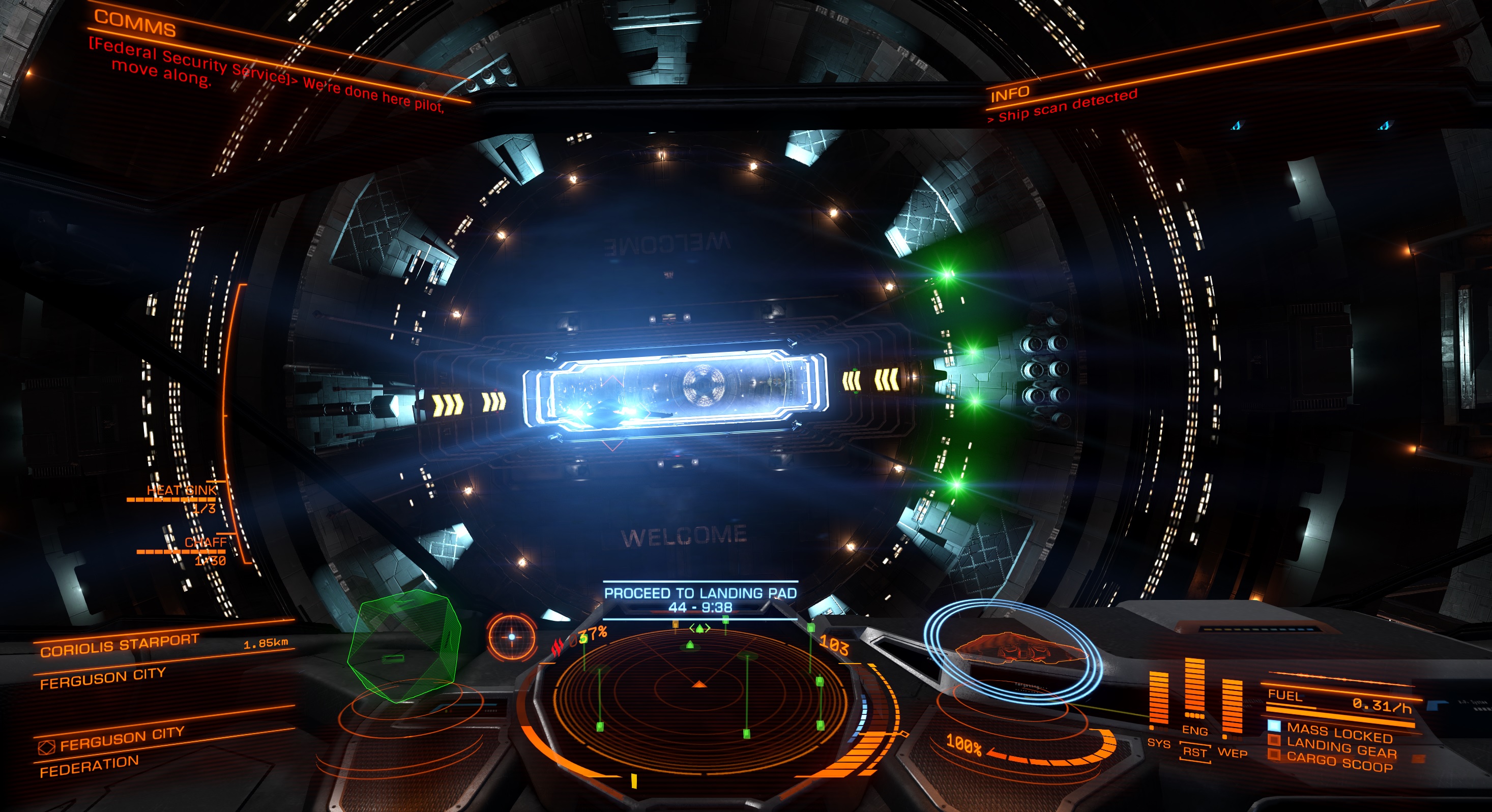 After another few trips I was again the victim of a police stitch-up. This time when I came to smuggle myself into the station I set everything up perfectly. I drifted towards the docking slot (perfectly lined up) while chanting “Don’t forget thrusters or flight-assist. Don’t forget thrusters or flight-assist”. Ironically, I wouldn’t have needed either as I’d lined up so well I was drifting into the station without needing to adjust my course.