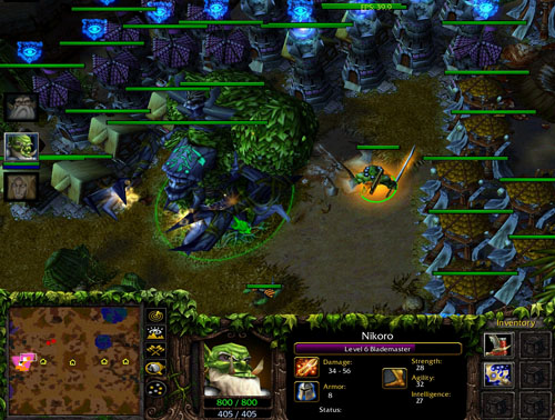 Because everyone’s base was in the middle of a forest, I could make my own path in. Over the course of the game I manually micro’d the heroic lumberjack and slowly chopped a road into his base, just behind the Maginot Line Of Tower Death. He’d invested so much into the tower defense that when my enormous army piled into squishy innards of his base it wasn’t much of a fight.