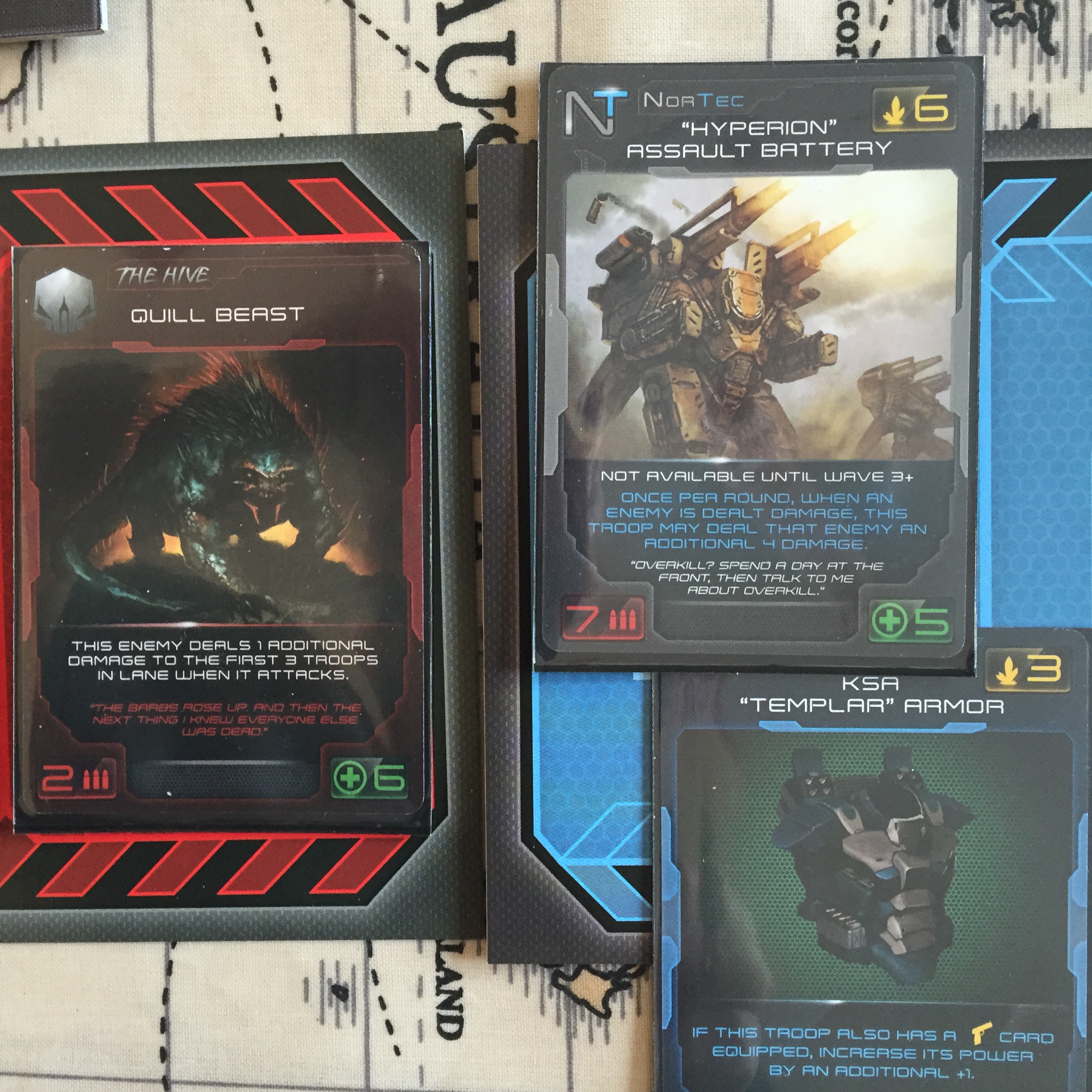 As the game goes on it progresses through three waves. Both the monsters attacking and the available troops improve. There’s a lot of strategy to how you spend your money; buying a lot of equipment early is good because equipment is useful all the way through the game (it doesn’t improve as the waves progress). That’s unlike the troops where wave 1 troops are pretty-much useless near the end of the game so you don’t want your deck clogged up with them. On the other hand, guns and armour can’t defend on their own so if you skimp on buying troops you’re going to let the monsters through and be behind when the really nasty critters appear in wave 3.