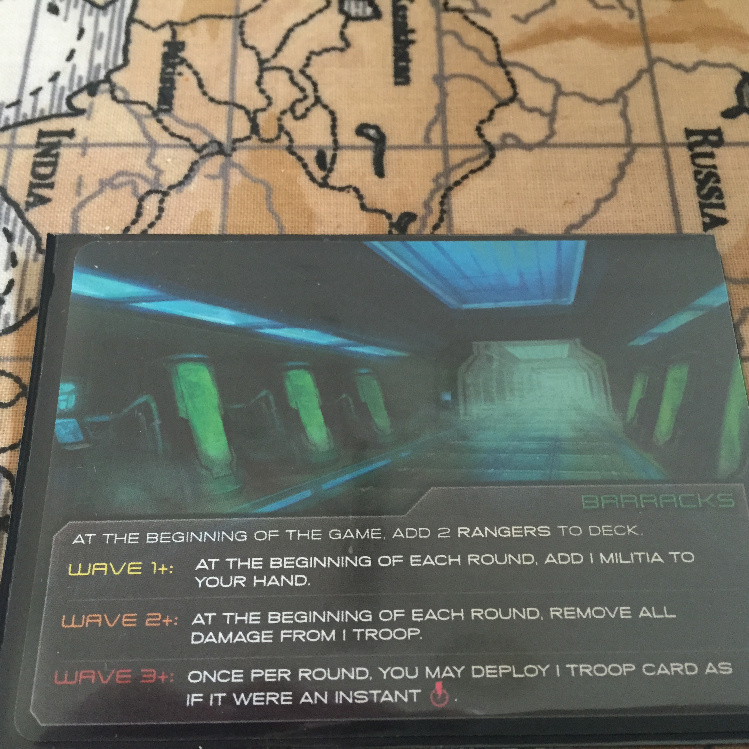 While there’s lots of re-playability the game itself is no pushover. We started off pretty badly; by the second round we’d lost almost half of the base’s health. As our decks improved we managed to slowly staunch the bleeding but it was looking like it would be too late. Ironically, as we started to assume we were going to lose we performed better. Players would burn abilities and instants on other people’s turns, assuming the game would be over before it got to them. This meant we survived 3 rounds at the end where the base was basically a smouldering ruin. Even with our awful start we managed to claw it back so that we died on round 8; not bad for a first go.