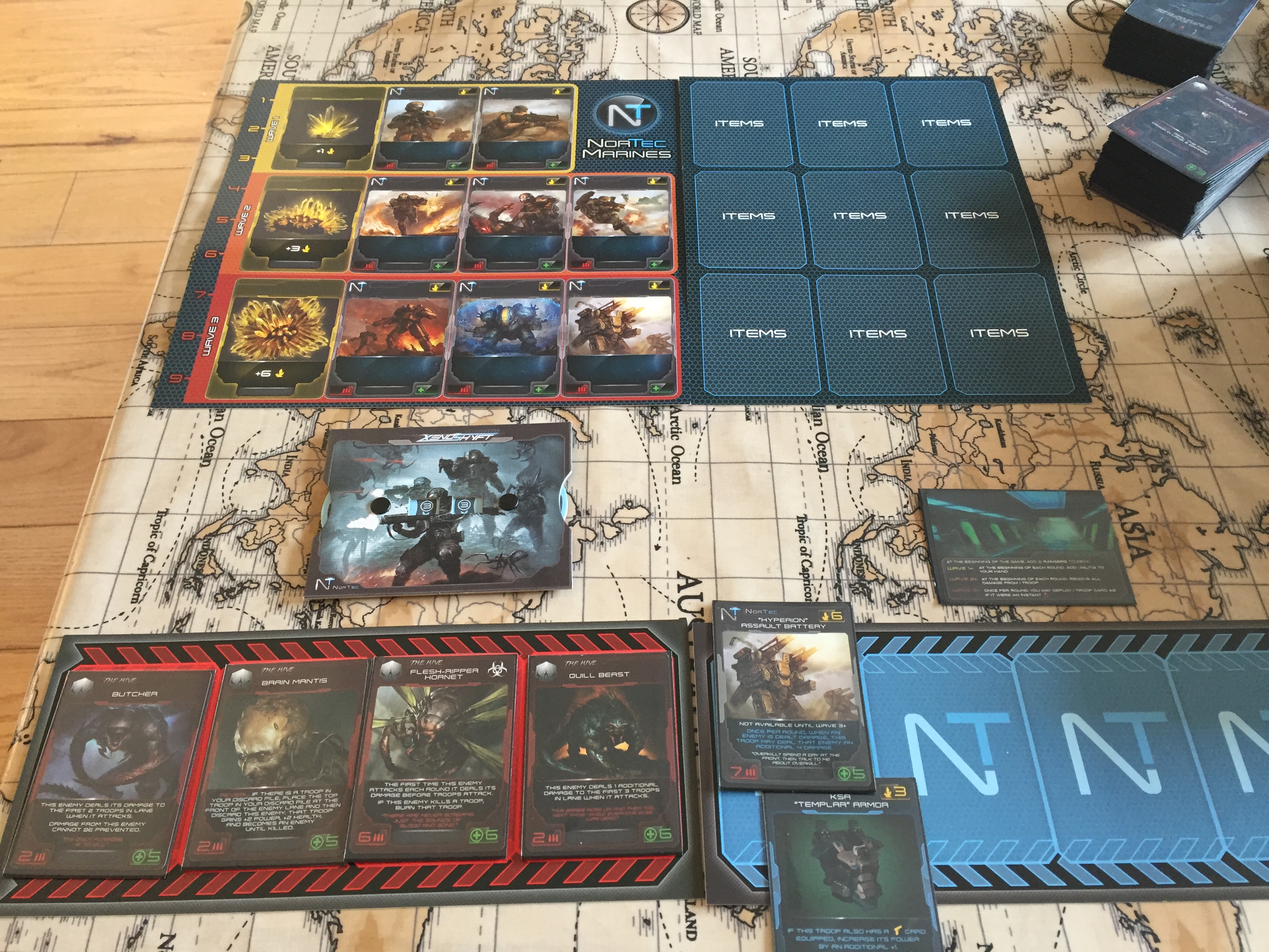 I played my first game of XenoShyft Onslaught a few weeks ago. The full release of the game was May 1st but I got a copy a bit early as I backed it on Kickstarter. It’s a co-op, card-building base-defense game; heroic / mercenary corporate troopers hold off waves