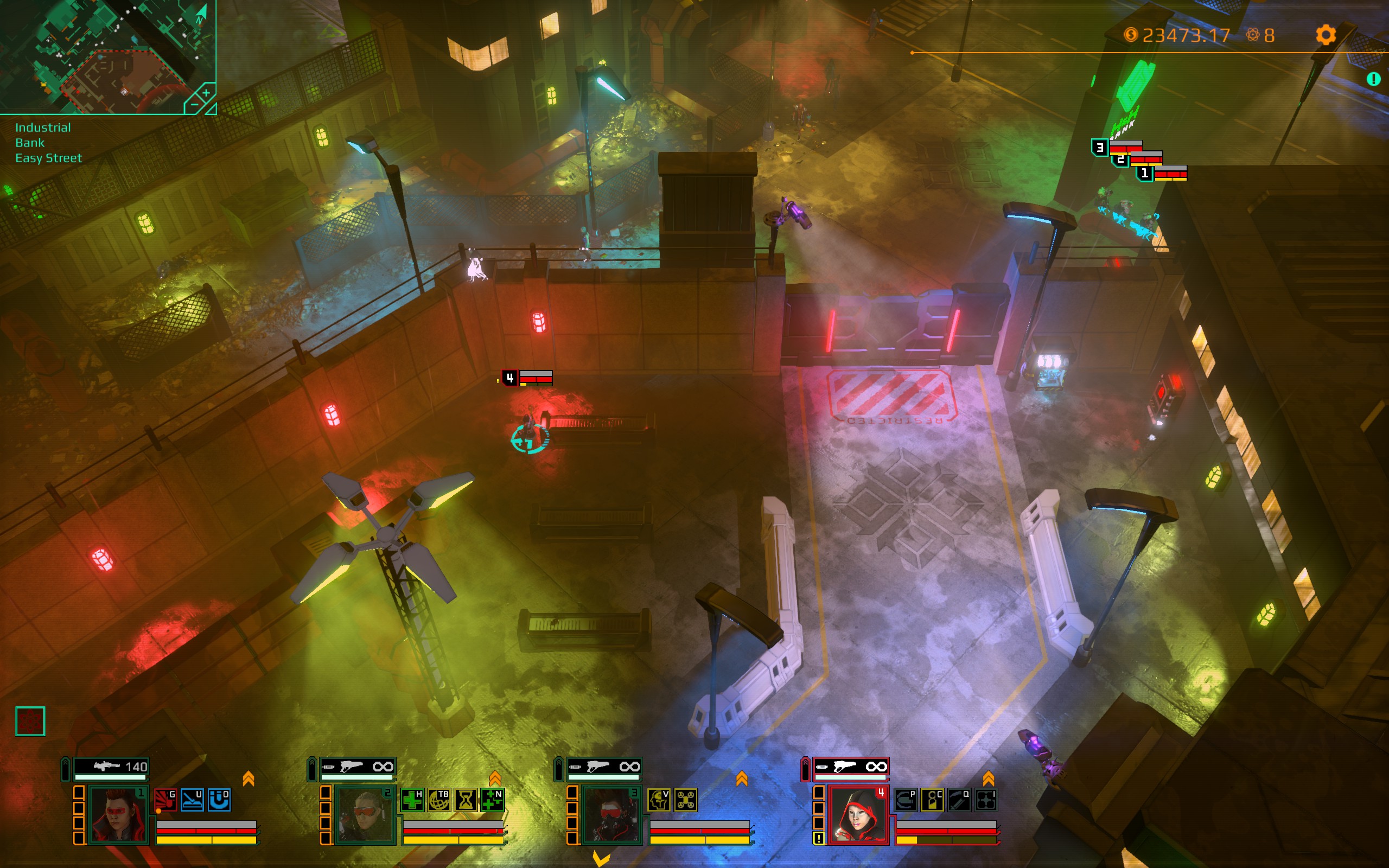 Satellite Reign is an isometric open world where you can send your team anywhere you like to advance your aims. You normally have a list of potential missions but you can accomplish them in whatever order or whatever way you choose. Or not achieve them at all; I got distracted by an opportunity to rob a bank (two guards had left it to arrest another civilian) while in the middle of infiltrating the guard’s HQ. Whatever you decide to do you can go in all-guns blazing, stealth it, hack gun turrets, zipline in, use an energy surge to super-sprint in or whatever you feel like doing.