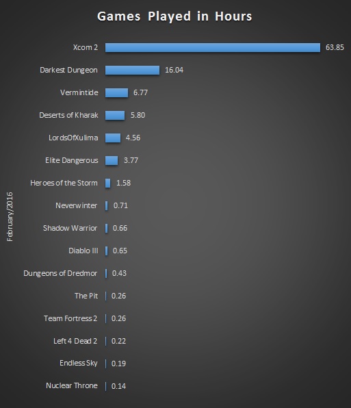 The other most played games were a bit more seasonal 😀 XCOM 2 was over one really intense week and you can see the Season 4 duration for Diablo 3.