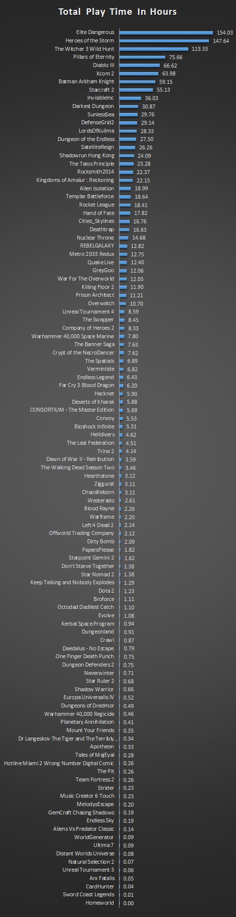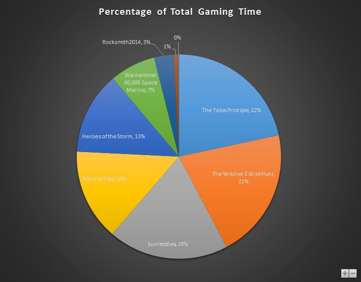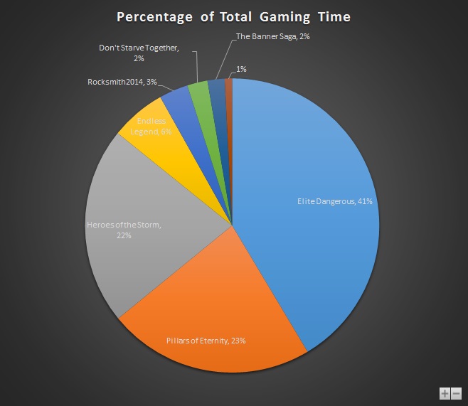 I’m not surprised about Elite:Dangerous being top; it’s been out over a year and I’ve dived into it in fits and starts throughout. Heroes of the Storm is in second place; it’s pitched perfectly to grab a quick game or two with my friends, wife or kids. And the Witcher was just massive 🙂