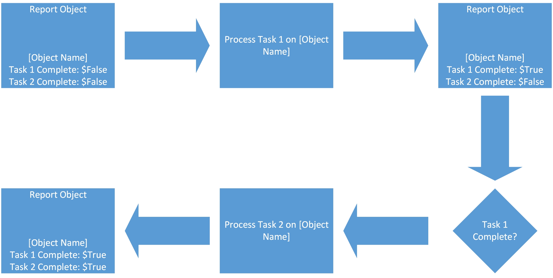 This creates a new ReportObject with an Identifier field, two “Task Complete” boolean fields and a Note field. If a TargetObject is passed it populates the Identifier with a unique representation of the object we’re going to make changes to. Here I’ve assumed it’s going to be a mailbox so I’ve used the DistinguishedName but you could use anything (SamAccountName, UPN, a unique key etc).