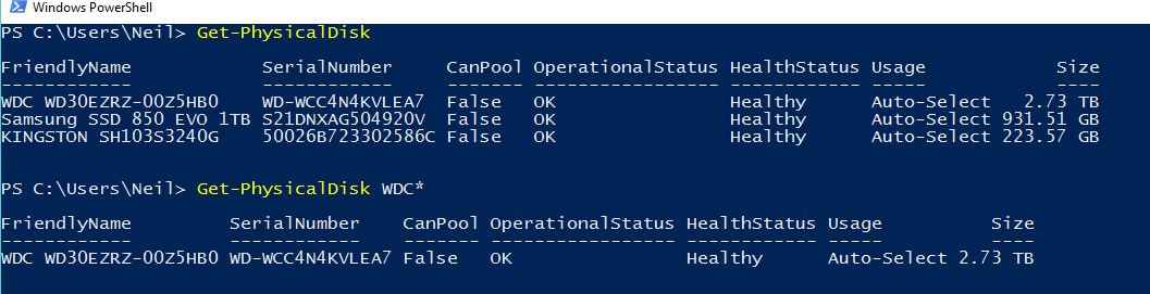 So let’s say I wanted to get the size of one of my physical disks. I can use wildcards in Get-Command to work out what I need;