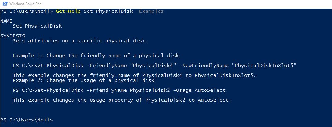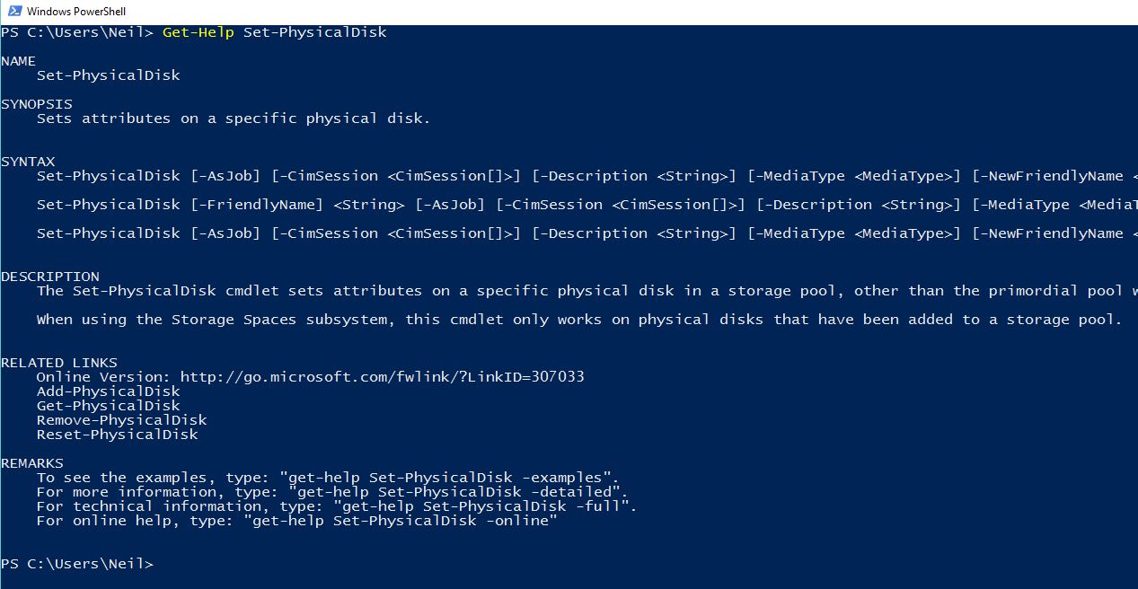 If I then wanted to work out how to make some changes on my Physical Disk I could use Get-Help to get the information on the Set-PhysicalDisk cmdlet (remembering that Set- was a common verb to make changes to an object).