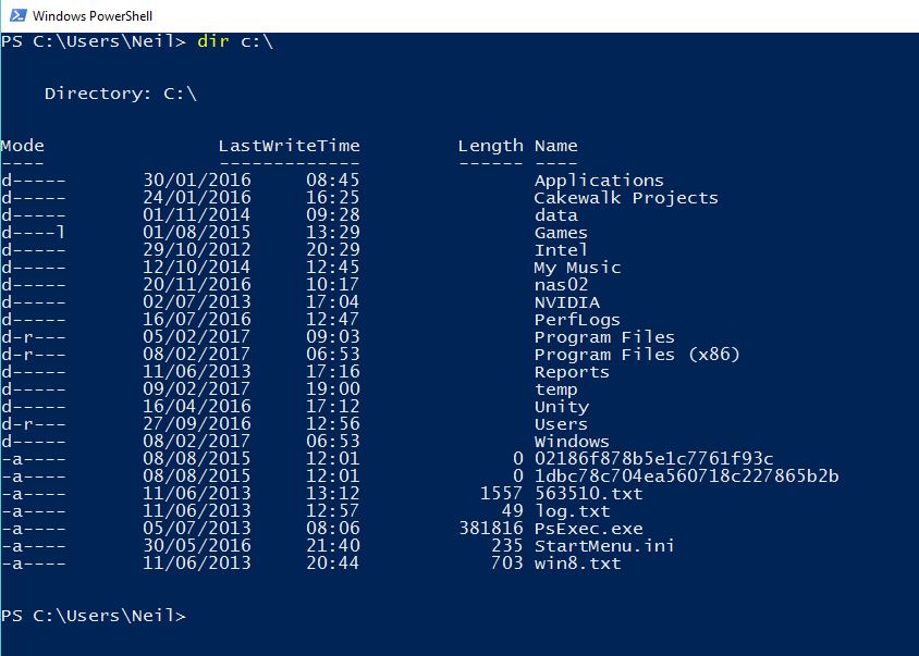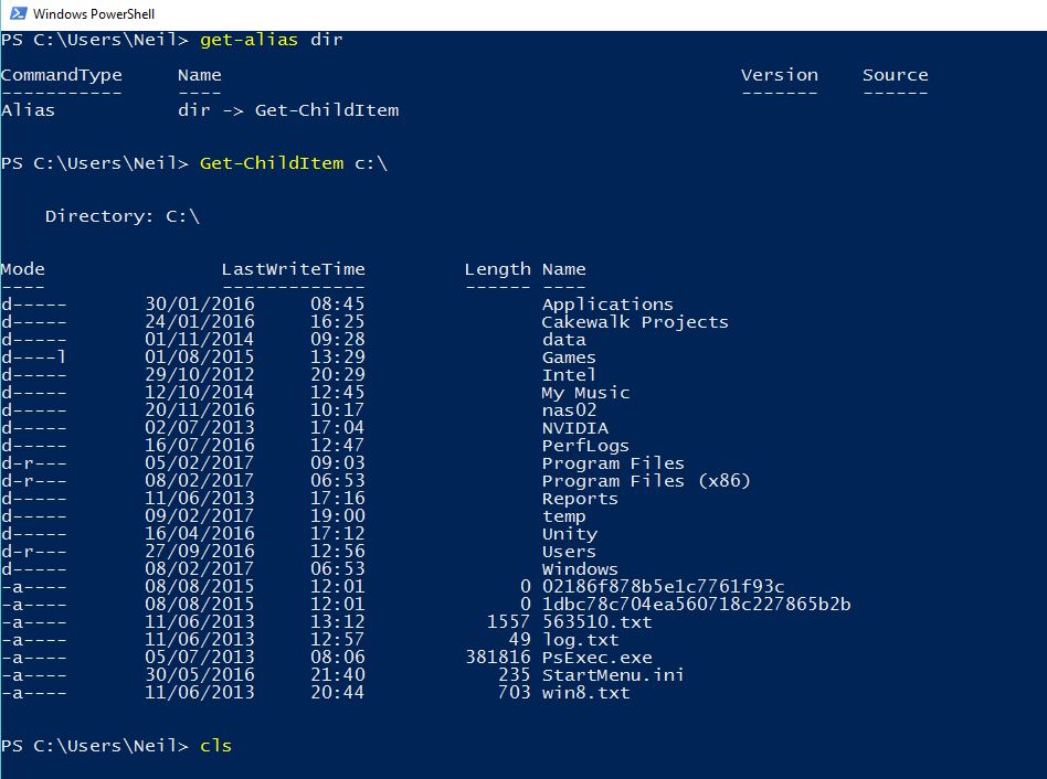 PowerShell is designed to make people coming from other systems feel at home. A lot of commands have aliases to commands used in other shells. If you’re familiar with DOS you can just use DOS commands;