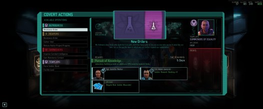 This allows you to tailor the game as you see fit but the double-AP bonus is really too good to miss. My choices near the end of the game were below. You really want to work on finding the Chosen base locations ASAP to unlock new slots for each resistance group.
